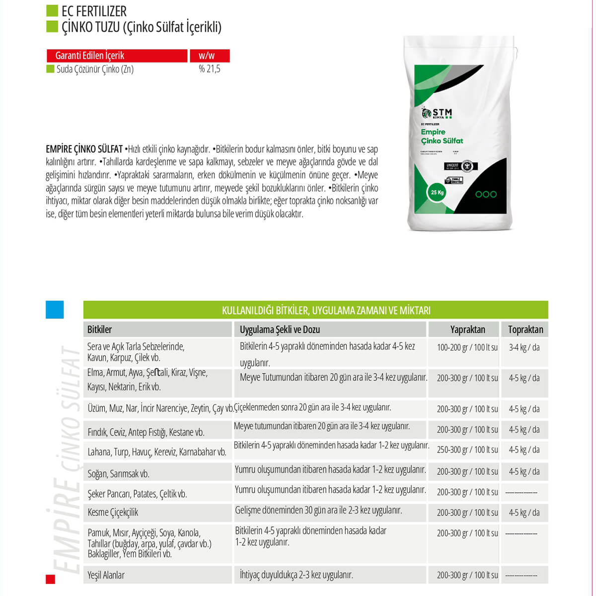 EMPİRE Çinko Sülfat, bitkiler için hayati öneme sahip mikro besinlerden biri olan çinkonun hızlı ve etkili bir kaynağıdır. Özellikle toprakta çinko eksikliğine bağlı gelişim geriliklerinin önlenmesi ve verimin artırılması amacıyla kullanılır. Suda çözünebilen formu sayesinde hem topraktan hem yapraktan uygulanabilir.
