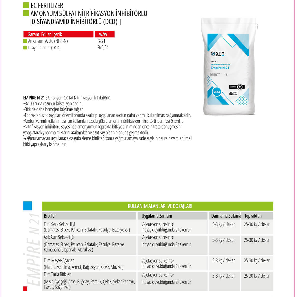 EMPİRE N 21, yüksek kaliteli %21 azot içeren amonyum sülfat formundaki, nitrifikasyon inhibitörü ilavesiyle geliştirilmiş özel bir azot gübresidir. Tarımsal verimliliği artırırken, çevresel kayıpları minimize eden modern gübreleme teknolojisinin güçlü bir örneğidir.