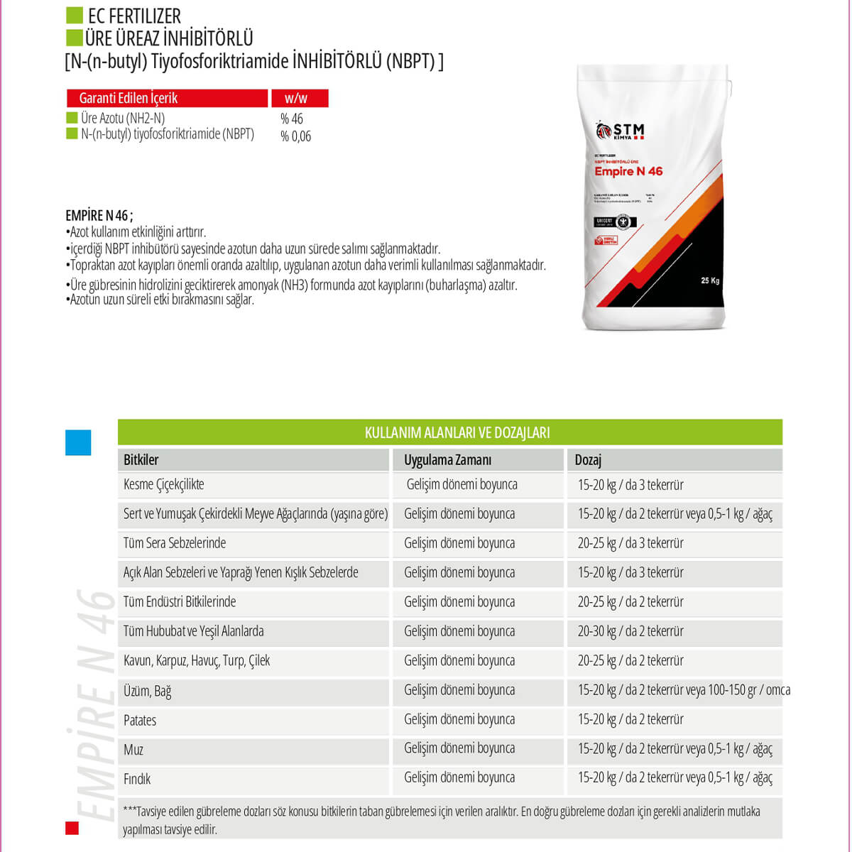 EMPİRE N 46, içeriğinde bulunan NBPT (N-(n-butyl) tiyofosforiktriamide) inhibitörü sayesinde azot kullanım etkinliğini en üst seviyeye taşıyan özel formüle edilmiş bir inhibitörlü üre gübresidir. Azotun toprakta daha uzun süre kalmasını sağlar, buharlaşma ve yıkanma yoluyla oluşan kayıpları minimuma indirerek tarımsal verimliliği artırır.