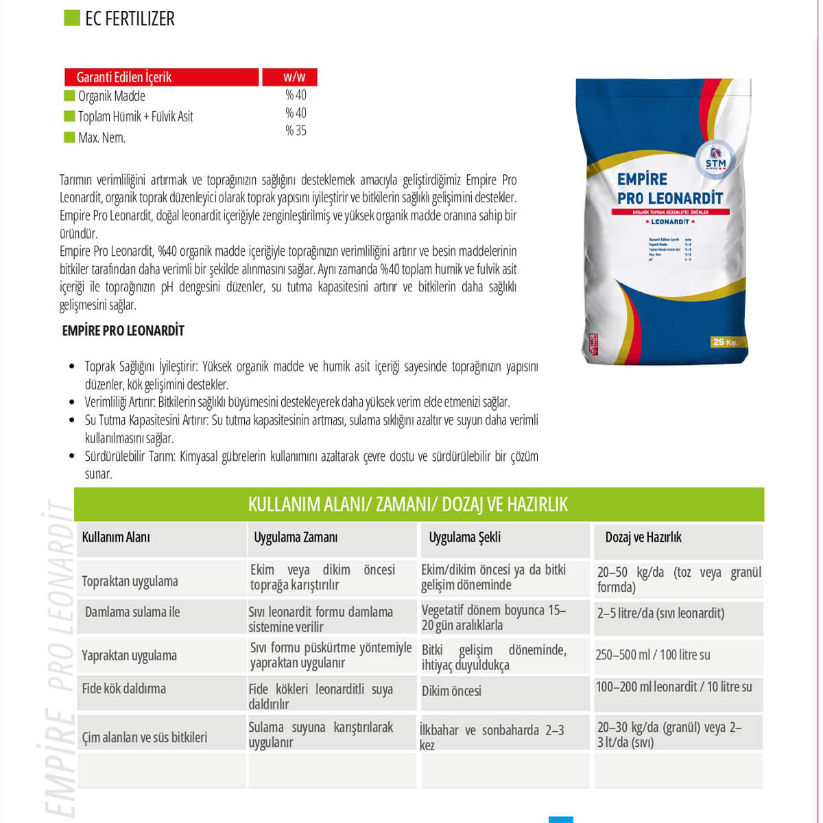Empire Pro Leonardit, doğal leonardit minerali ile zenginleştirilmiş, yüksek oranda organik madde içeren etkili bir toprak düzenleyicidir. %40 organik madde ve %40 toplam humik ve fulvik asit içeriği sayesinde toprağın yapısını iyileştirir, pH dengesini düzenler ve bitkilerin besin maddelerini daha verimli almasını sağlar.