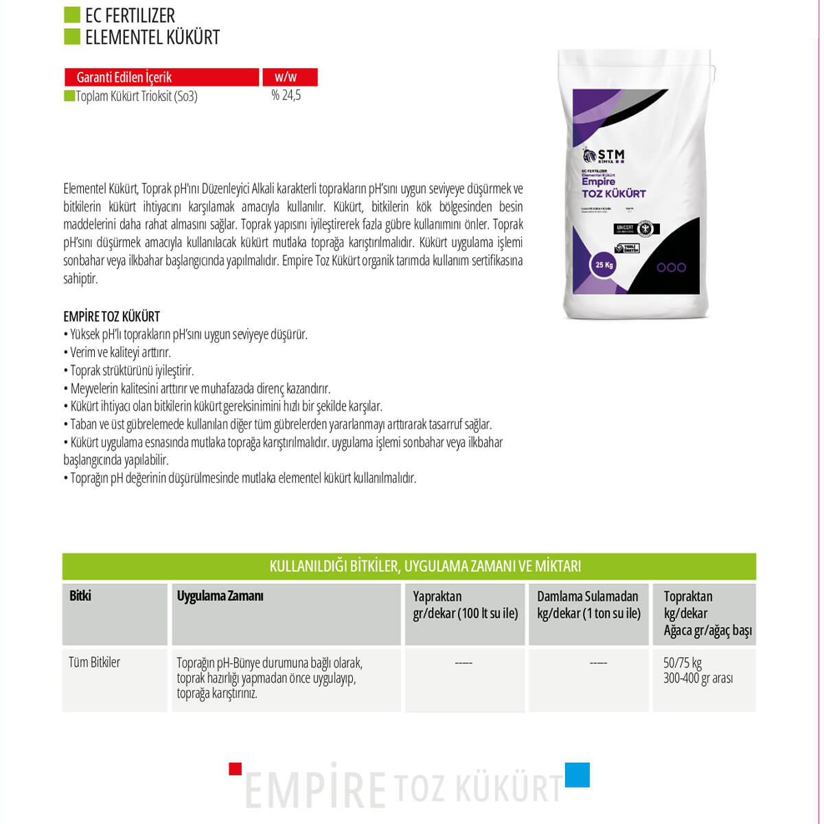 Empire Toz Kükürt, yüksek pH’lı alkali toprakların pH seviyesini uygun aralığa düşürmek ve bitkilerin kükürt ihtiyacını karşılamak amacıyla geliştirilmiş saf elementel kükürt ürünüdür. Toprağa karıştırılarak uygulandığında, toprak yapısını iyileştirir ve bitkilerin besin maddelerini daha etkin almasını sağlar.
