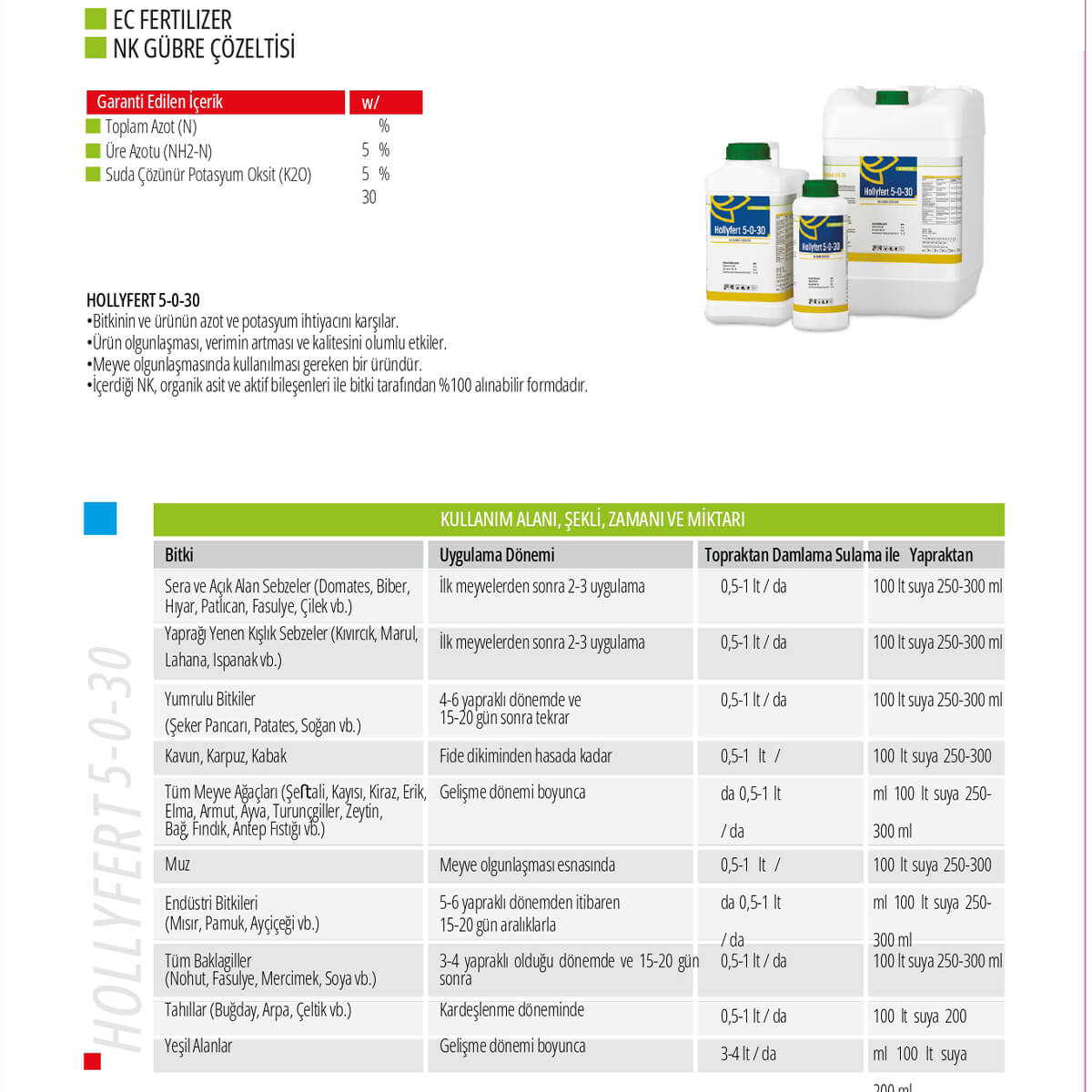 HOLLYFERT 5-0-30, bitkilerin azot ve potasyum ihtiyacını dengeli şekilde karşılayan, ürün olgunlaşmasını destekleyen ve verim ile kaliteyi artıran özel bir NK gübre çözeltisidir. İçeriğindeki organik asitler ve aktif bileşenler sayesinde bitki tarafından %100 kolaylıkla alınır.