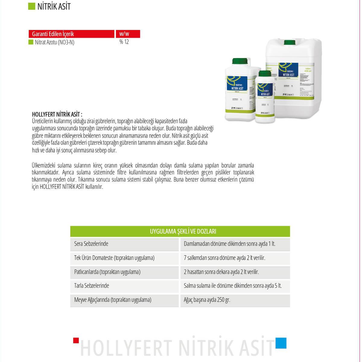Hollyfert Nitrik Asit, %12 nitrat azotu (NO₃-N) içeriği ile toprağın gübreyi tam olarak absorbe etmesini sağlayan güçlü bir asit çözücüdür. Üreticilerin aşırı gübre uygulamalarında oluşan pamuksu tabakayı çözerek toprağın gübreyi daha etkin kullanmasını sağlar. Bu sayede bitkiler daha hızlı ve verimli beslenir, beklenen verim artışı gerçekleşir.