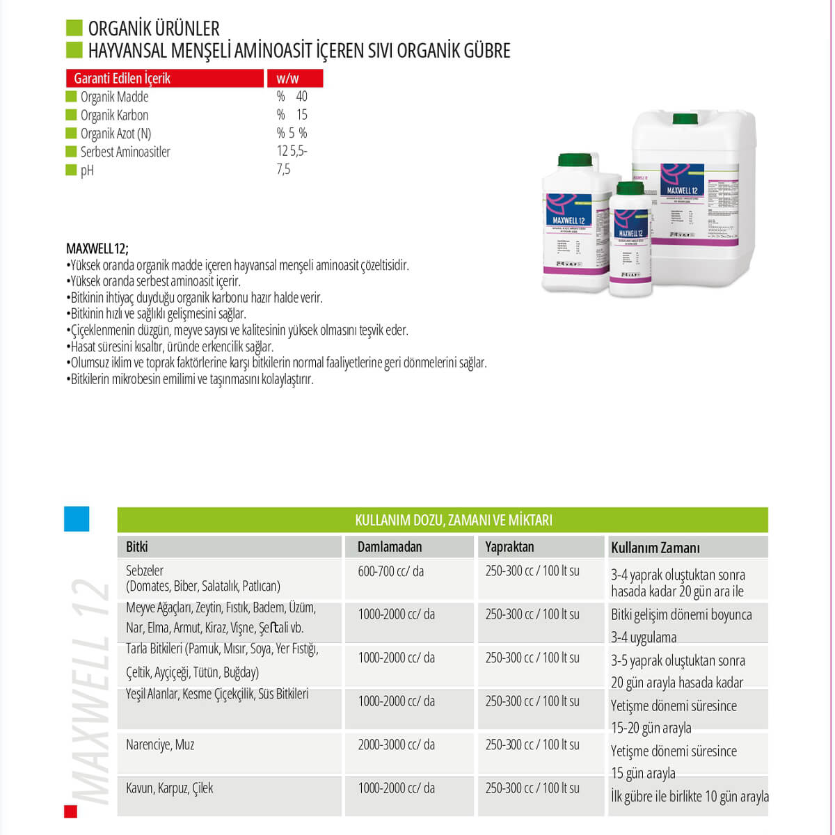 Maxwell 12, yüksek organik madde ve serbest aminoasit içeren hayvansal kaynaklı özel bir sıvı organik gübredir. Bitkiye ihtiyaç duyduğu organik karbonu hazır şekilde sunarak, bitkinin güçlü ve sağlıklı gelişimini destekler.
