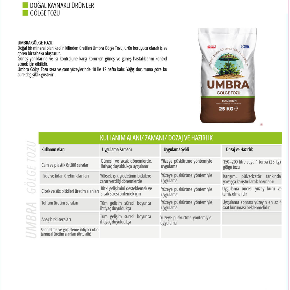 UMBRA Gölge Tozu, doğal bir mineral olan kaolin kilinden üretilmiş, bitkileri ve yapıları dış etkenlere karşı korumak için geliştirilmiş çevre dostu bir ürün koruyucudur. Yüzeyde oluşturduğu beyaz film tabakası sayesinde güneş ışığını yansıtarak sıcaklığı düşürür, güneş yanıklarını ve sıcaklık kaynaklı stresleri azaltır.